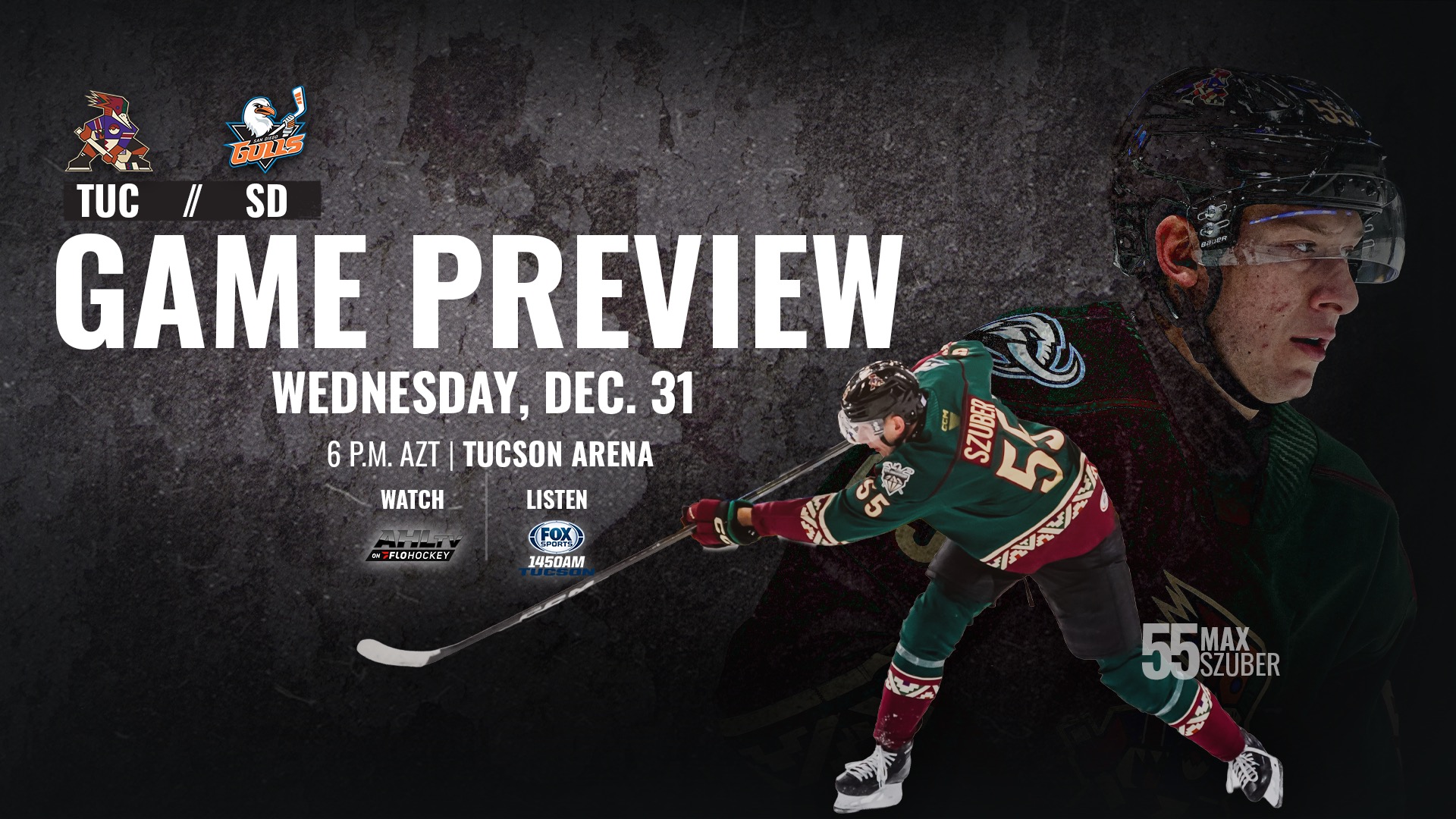 Tucson currently sits ninth in the Pacific Division with 28 points, three points back of Henderson and Bakersfield. San Diego holds sixth place with 33 points, one point behind Coachella Valley and two back of Calgary.