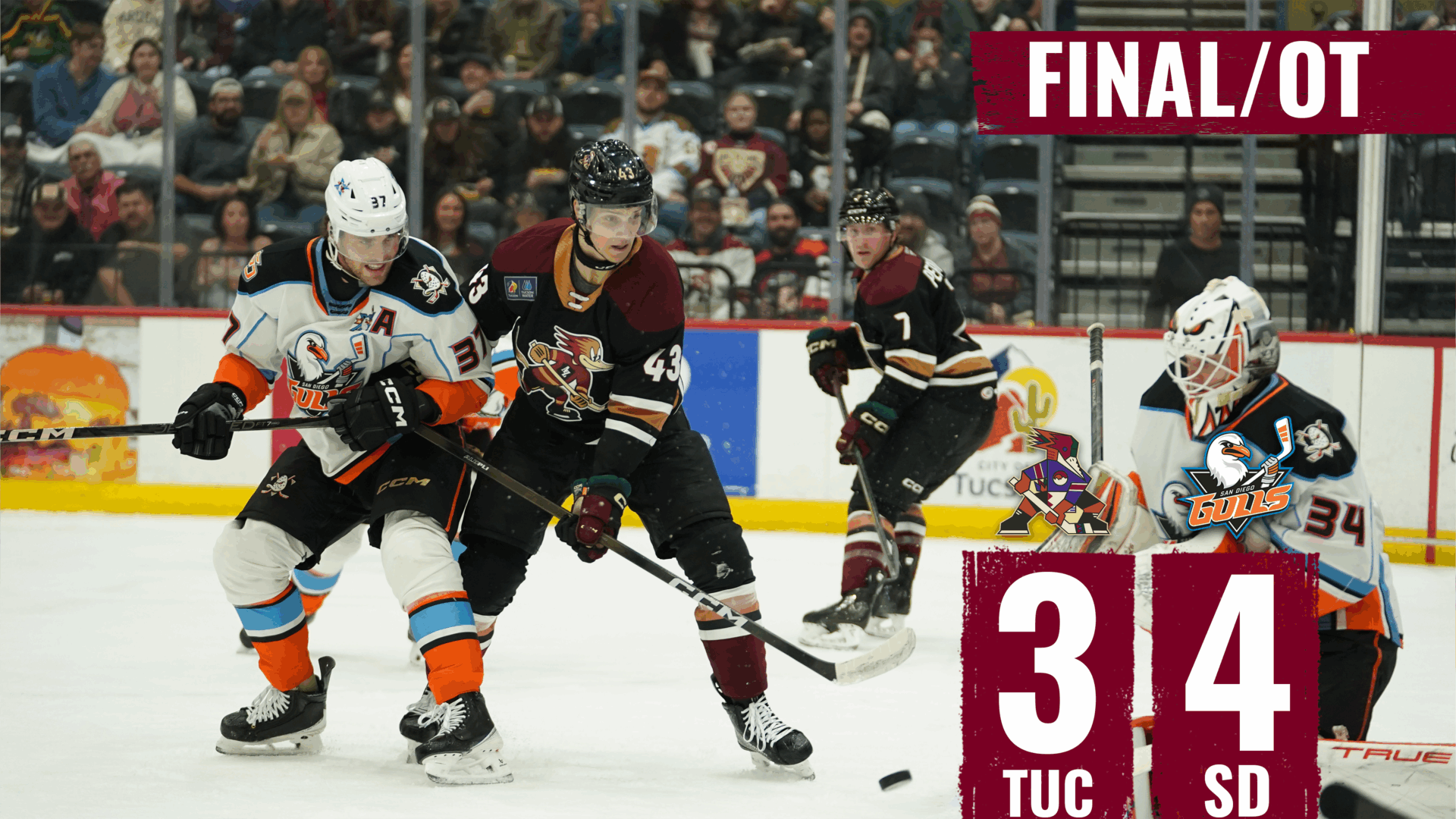 TUCSON, AZ– The Tucson Roadrunners (12-12-5-0) closed out 2025 with a 4-3 overtime loss to their I-8 rival San Diego Gulls (14-8-6-1) on Wednesday night at Tucson Arena.