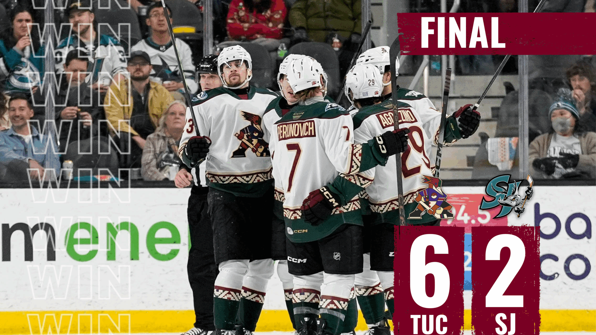 San Jose pulled Carriere with four minutes remaining and Hebig took advantage, scoring an empty-net goal with 3:29 left to complete his hat trick and seal Tucson’s 6–2 victory.