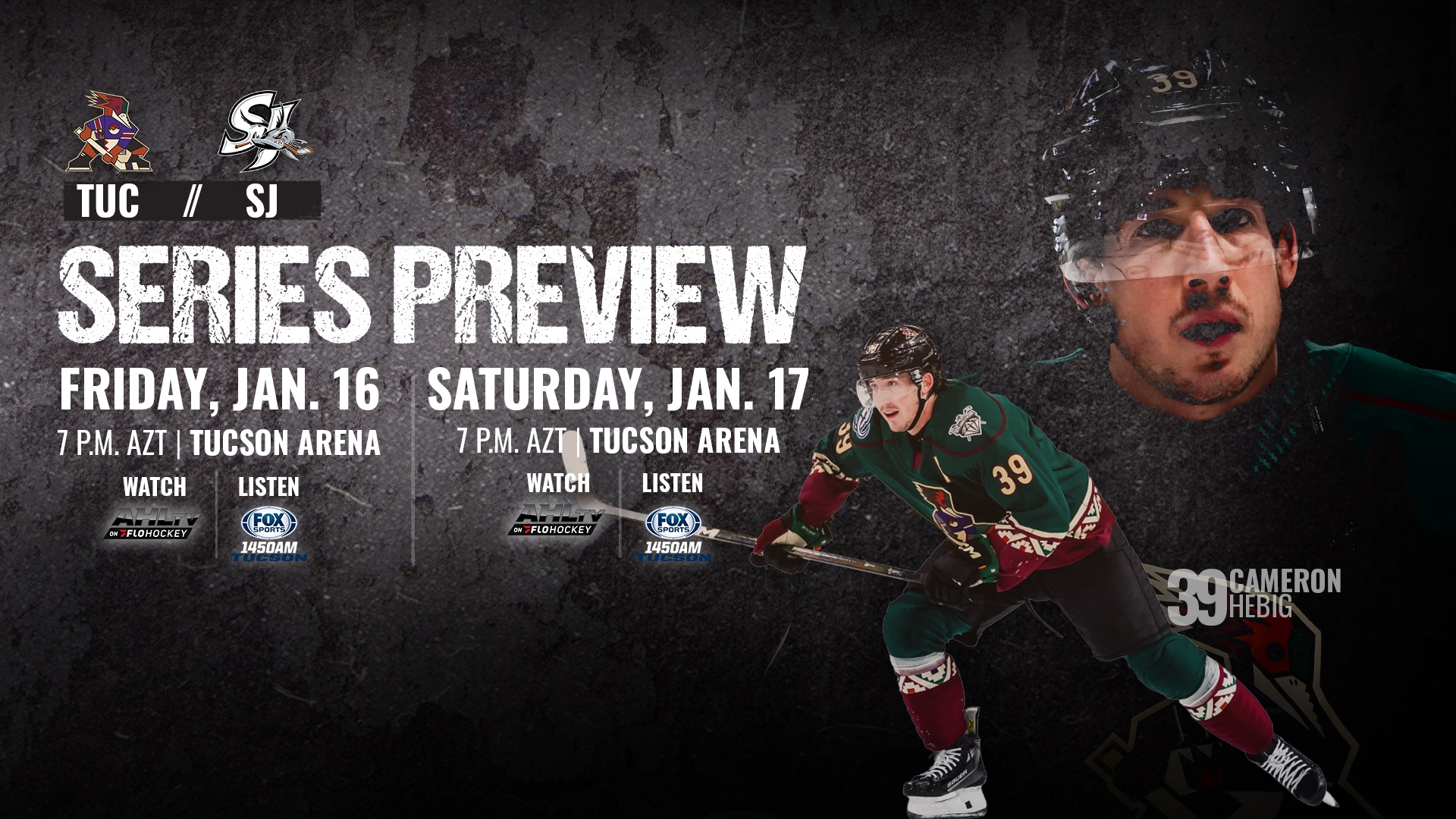 Game 1: Friday, Jan. 16 at 7 p.m. AZT, Tucson Arena
