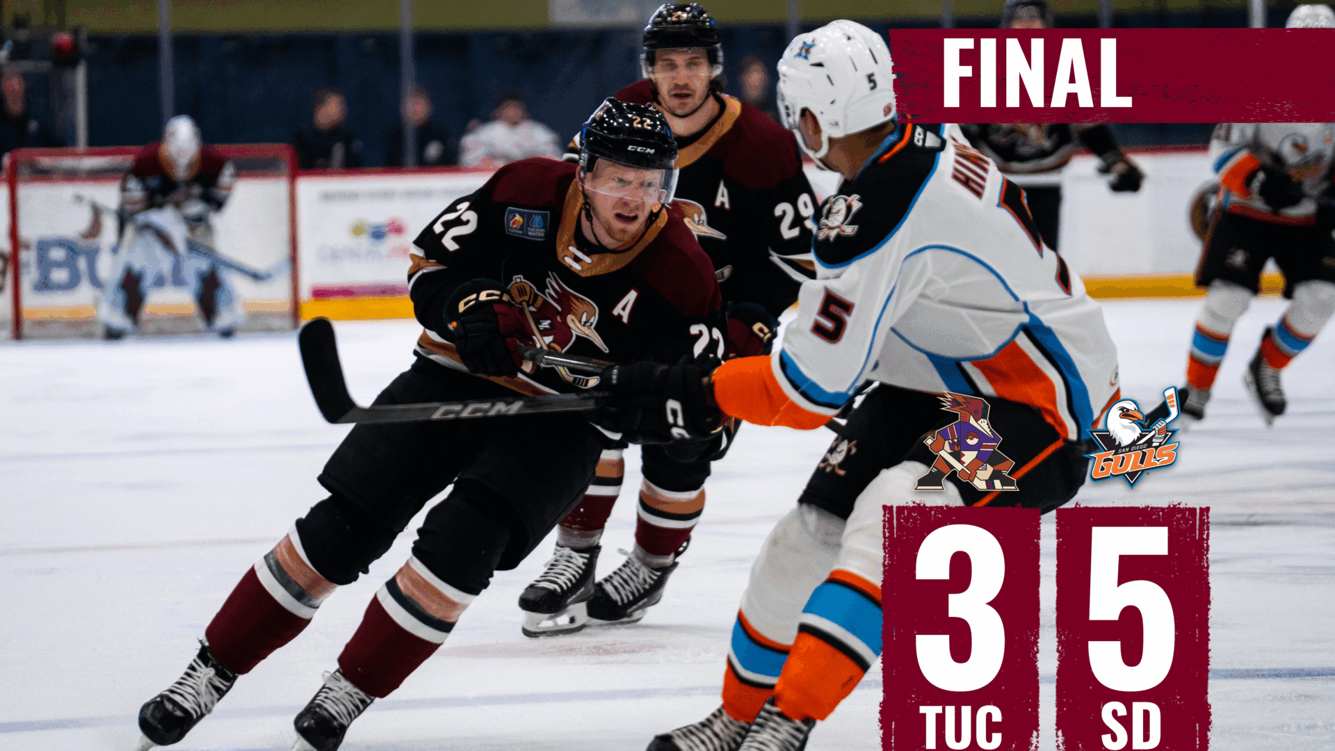 The Tucson Roadrunners (17-13-7-0) wrapped up their midweek series with a 5–3 loss to the San Diego Gulls (18-12-6-2) on Wednesday night at Tucson Arena.