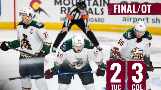 The Tucson Roadrunners rallied late but fell 3-2 in overtime to the Colorado Eagles on Saturday at Blue Federal Credit Union Arena.