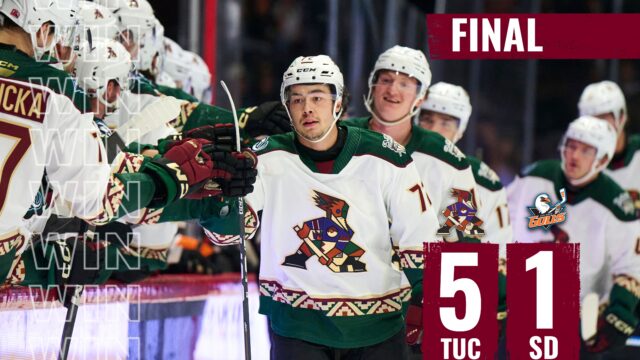 The Tucson Roadrunners led from start to finish to close their road trip with a 5-1 victory over the San Diego Gulls on Wednesday at Pechanga Arena.