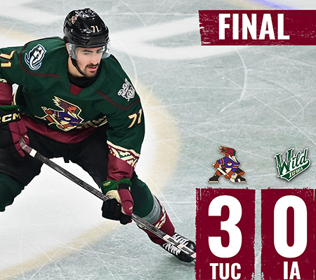 The Tucson Roadrunners (4-4-1-0) opened their weekend series with a 3-0 shutout win over the Iowa Wild (2-5-0-1) Saturday night at Casey's Center.