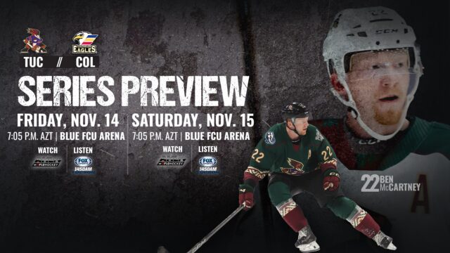The Tucson Roadrunners (5-5-2-0) travel to Loveland, Colorado, to open a weekend series against the league-leading Colorado Eagles (11-2-0-1) at Blue FCU Arena. Puck drop is scheduled for 7 p.m. AZT on both Friday and Saturday.